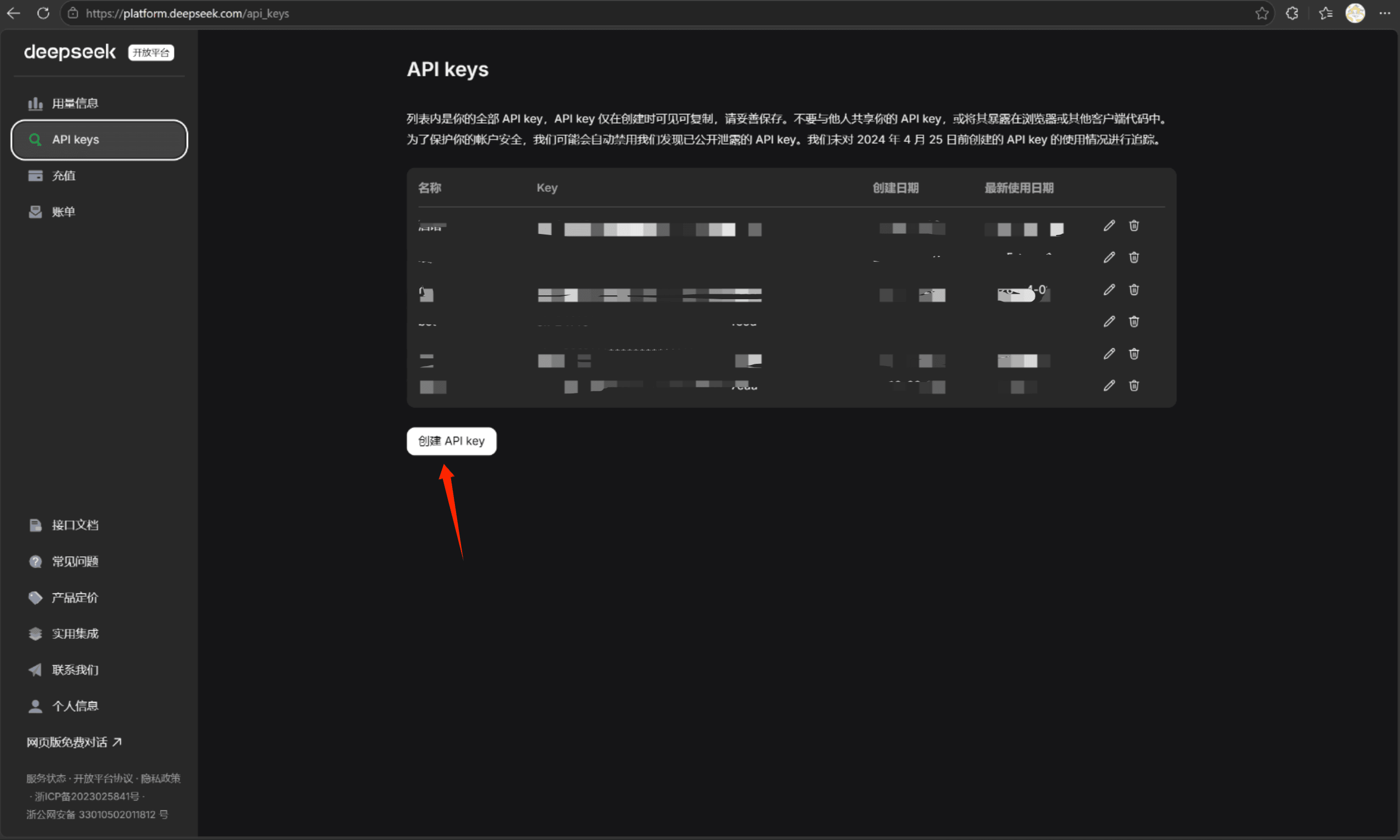 继续看左侧菜单然后点击API keys,然后如图所示创建key