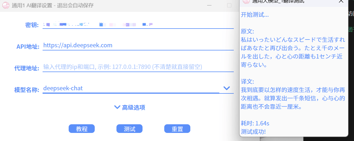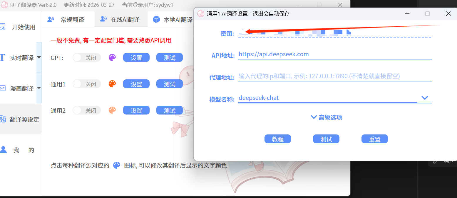 进入团子翻译器的翻译源设定,点击在线AI翻译任意一个接口,在密钥里面粘贴你刚才的API key,然后API地址与模型名称如图所示 API地址 :https://api.deepseek.com